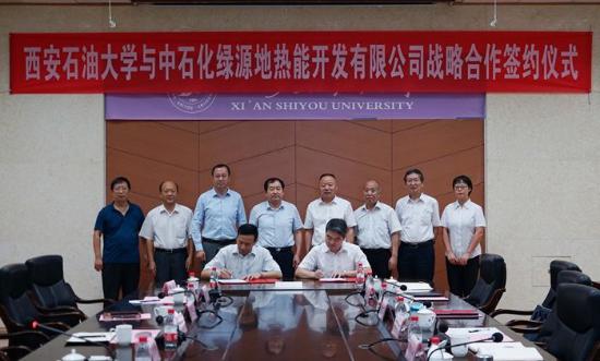 中石化绿源地热能(陕西)开发有限公司经理刘斌与西安石油大学石油工程学院院长周德胜代表双方签订了战略合作协议。协议有效期为三年,包涵了科研合作与学术交流、数据与资源共享、人才培养与学生就业、基地建设等具体内容。